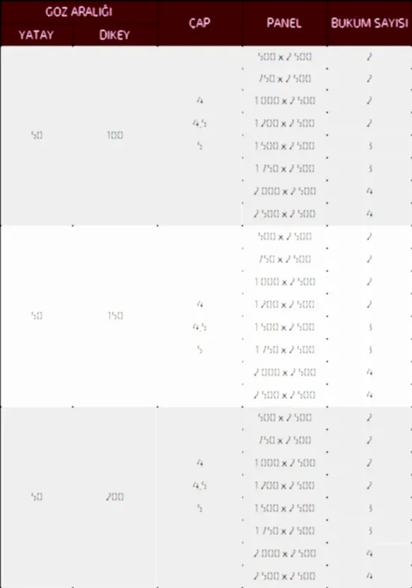 Note 1: The dimensions given in the table are STANDARD STOCK dimensions, and if requested, production can be made according to customer dimensions. Delivery times for custom-made panels depend on the production schedule on the order date.